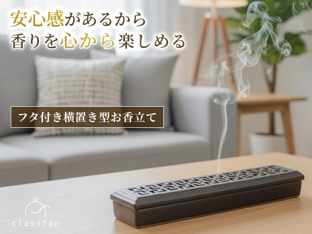 フタ付き横置き型のお香立てです。火のついた部分をフタがしっかり覆い、横置きでお香が倒れない構造なので、安全安心に香りを楽しめます。上品な艶と重厚感のある陶器製で、洋室にも和室にも調和します。日常のひとときから仏壇でのご供養まで、様々なシーンで生活に寄り添い使用できます。